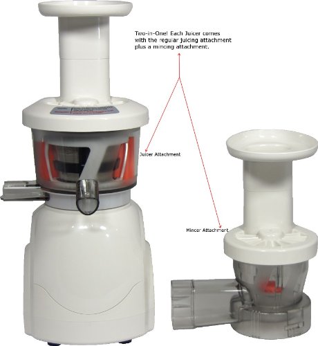 New! All white unit. Customers have requested a solid neutral color and now we have it. The same best in class HD-7700, same motor, same parts, same everything except a solid white exterior with a little more modern look.The Nutriteam model 7700 Juicer is the best juicer in it's class. From wheatgrass and leafy greens to carrots and beets this vertical juicer do it all. The large double edge grinding auger spins at only 47 RPM which preserves the enzymes and freshness of your juice, meanwhile the double edge auger cuts twice as fast. It also features a 200 watt motor, the most powerful vertical juicer on the market. What's Included?Each Juicer comes complete with the following:Main Unit.Juice extracting bowl Mincing bowl attachmentExtracting screenCleaning brushDetailed instruction manual and recipe bookWhy choose the Nutriteam Model 7700?The Nutriteam Model 7700 actually produces more juice and dryer pulp than many competing juicers. The parts of the juicer are the most up-to-date and most durable, e.g. 200 watt motor, Ultem plastic for Auger and Juicing screen. Comparable juicers by Hurom, Omega and Tribest sell from 0-399.00. All the top brand vertical juicers are manufactured in Korea, as is our model 7700 vertical juicer, which explains the many similarities in looks and performance. We offer this juicer at over 0.00 less, yet it is equal or better. Need we say more? The HD-7700 vertical design will save counter space, produce the freshest juice, and save you money. For question or technical details please call 1-800...